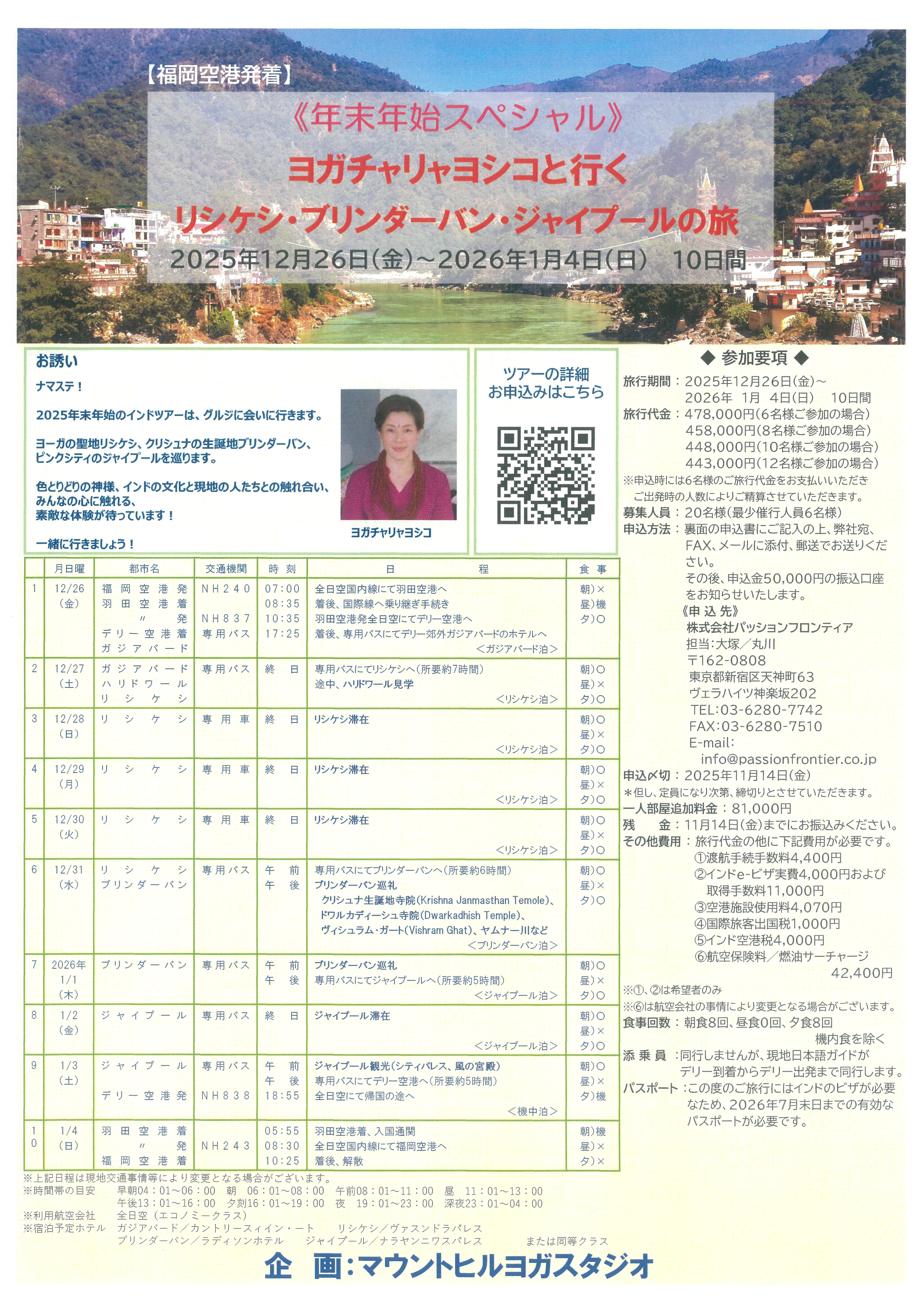 ナマステ!2025年末年始のインドツアーは、グルジに会いに行きます。ヨーガの聖地リシケシ、クリシュナの生誕地ブリンダーバン、ピンクシティのジャイプールを巡ります。色とりどりの神様、インドの文化と現地の人たちとの触れ合い、みんなの心に触れる、素敵な体験が待っています!一緒に行きましょう!